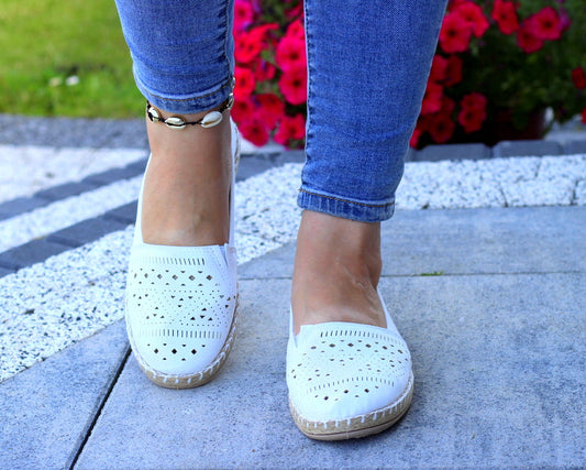 РазпродажбаBiałe płaskie espadryle z ażurowym wzorem