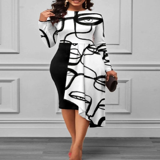 Drukowana sukienka V-neck z siedmioczęściowym rękawem