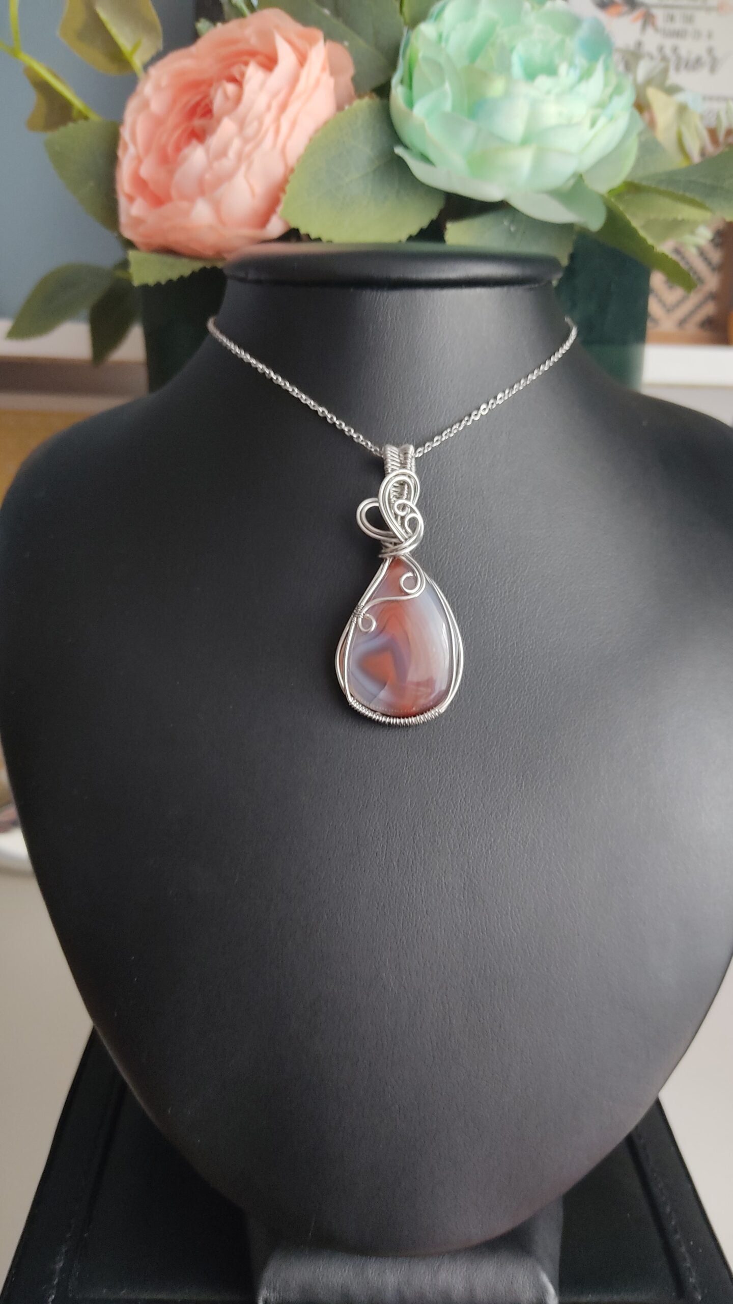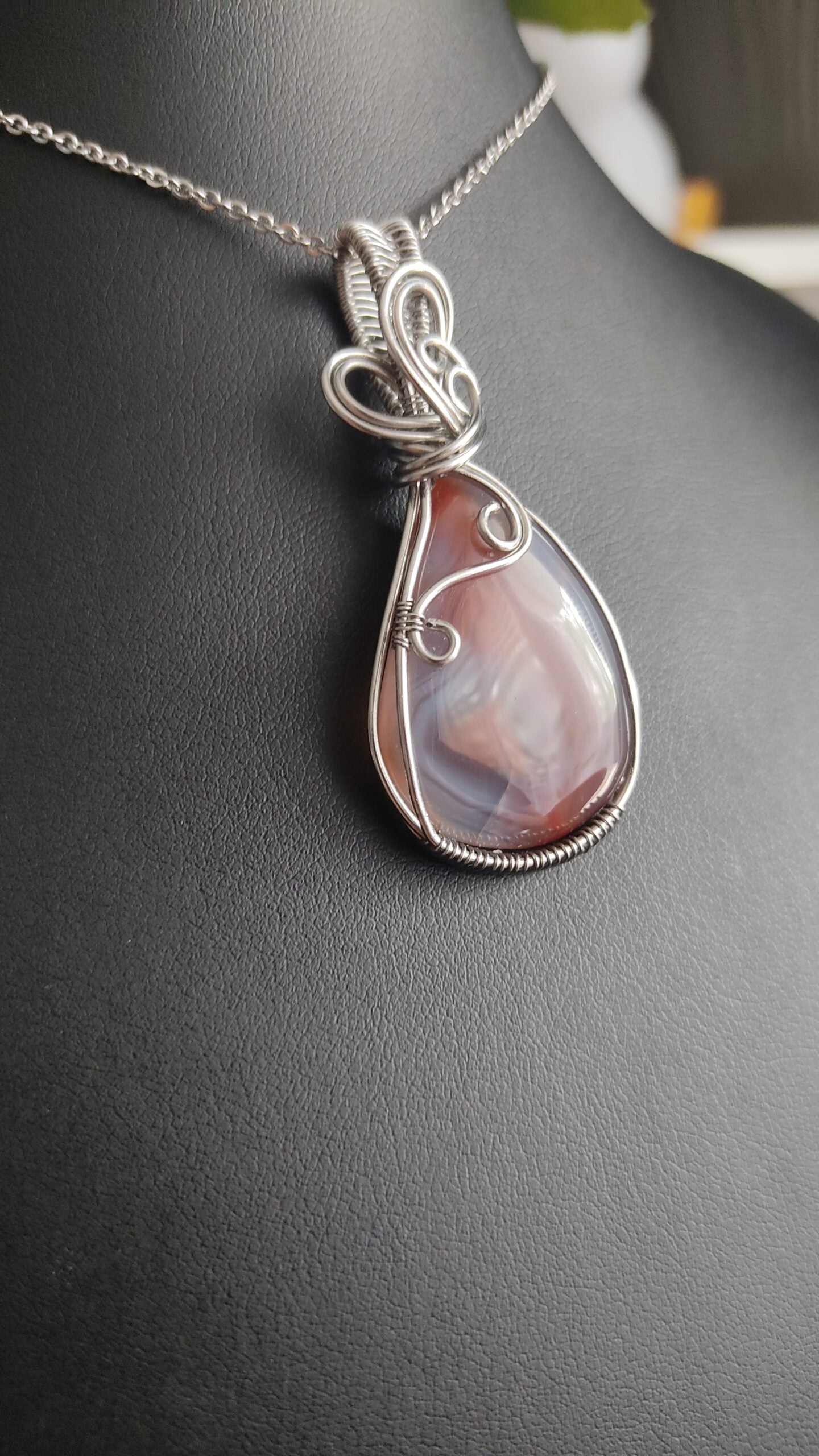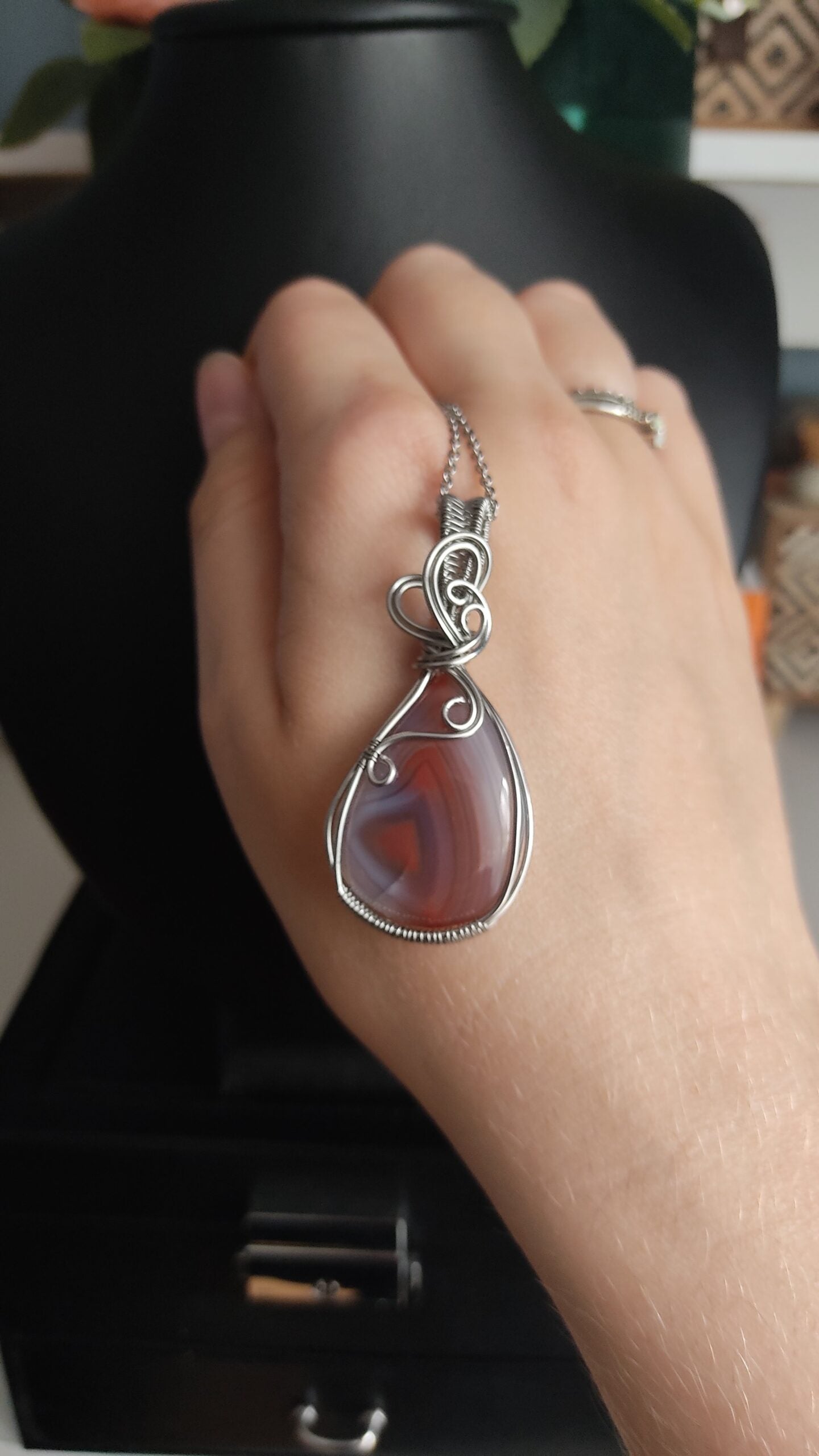 Ręcznie robiony wisiorek z agatem. Wykonany techniką wire wrapping z drutów ze stali chirurgicznej.