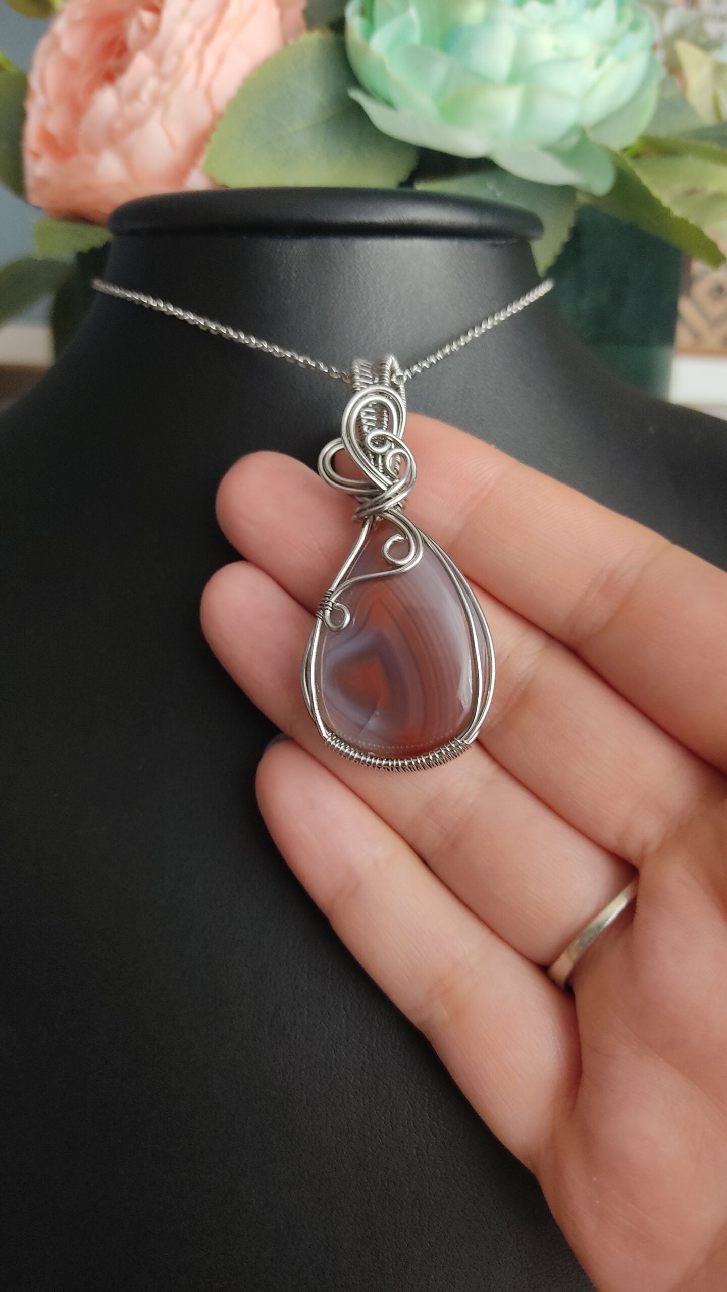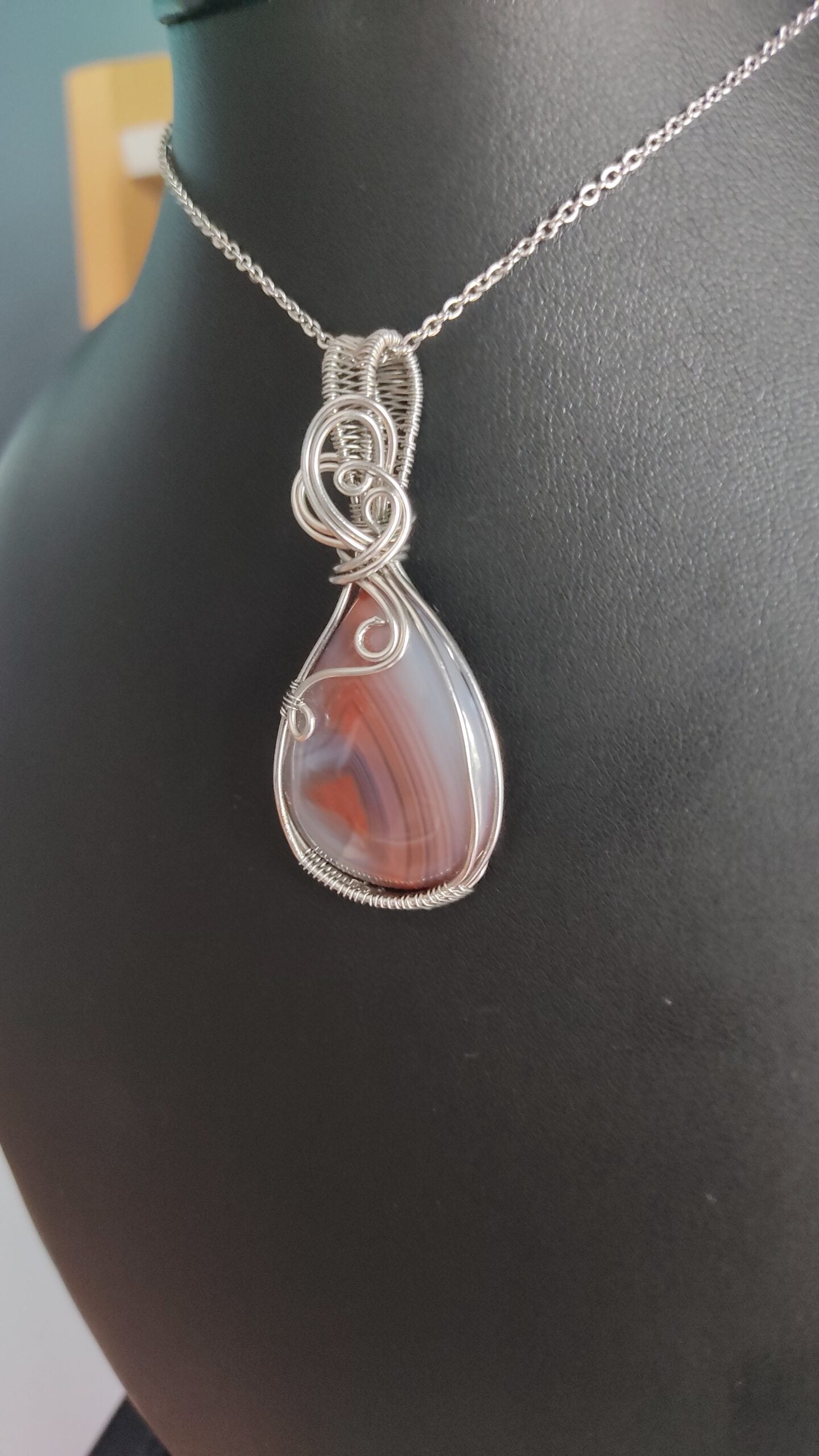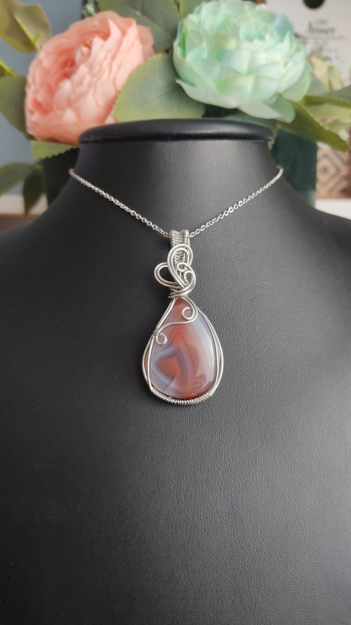 Ręcznie robiony wisiorek z agatem. Wykonany techniką wire wrapping z drutów ze stali chirurgicznej.
