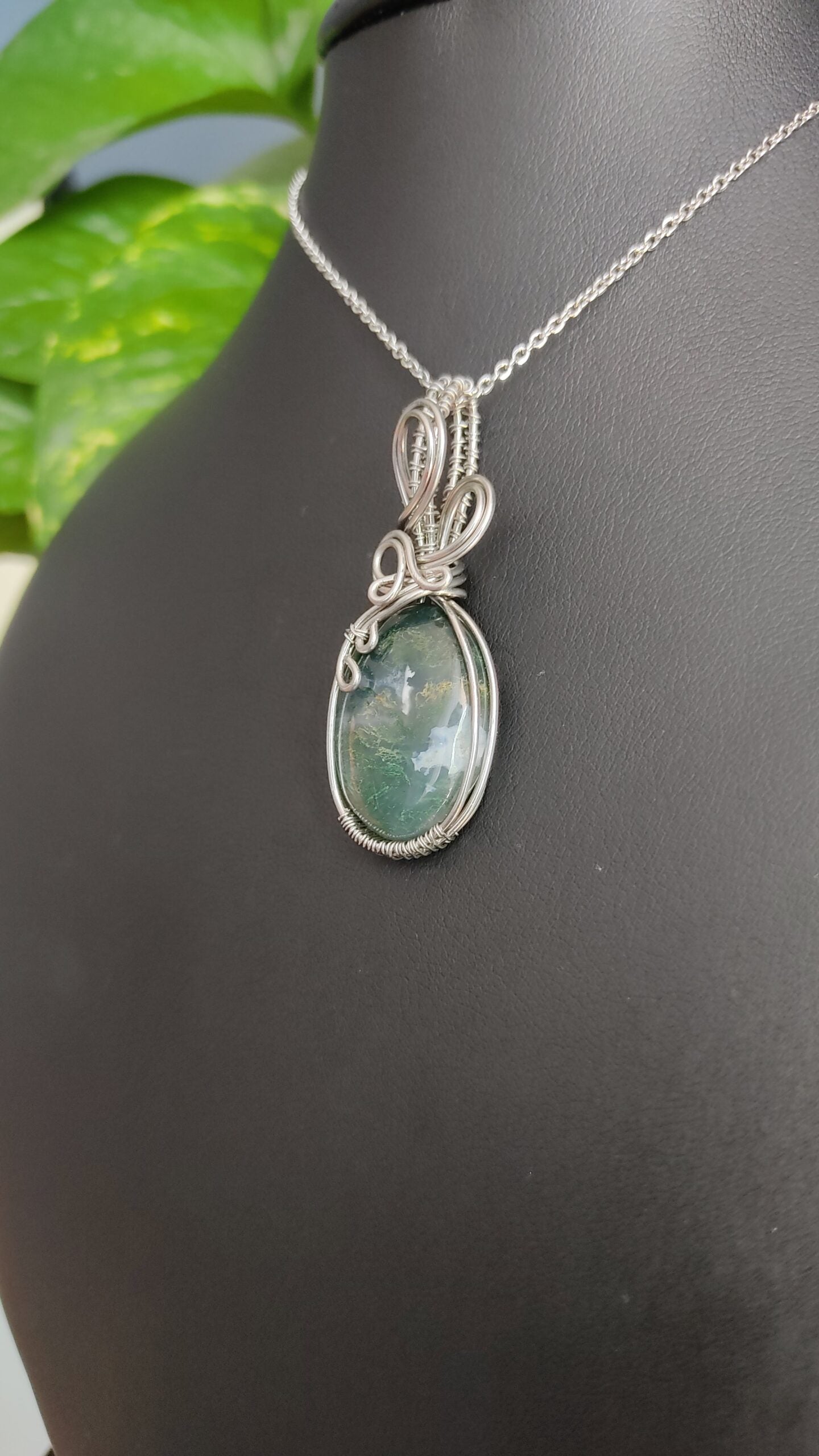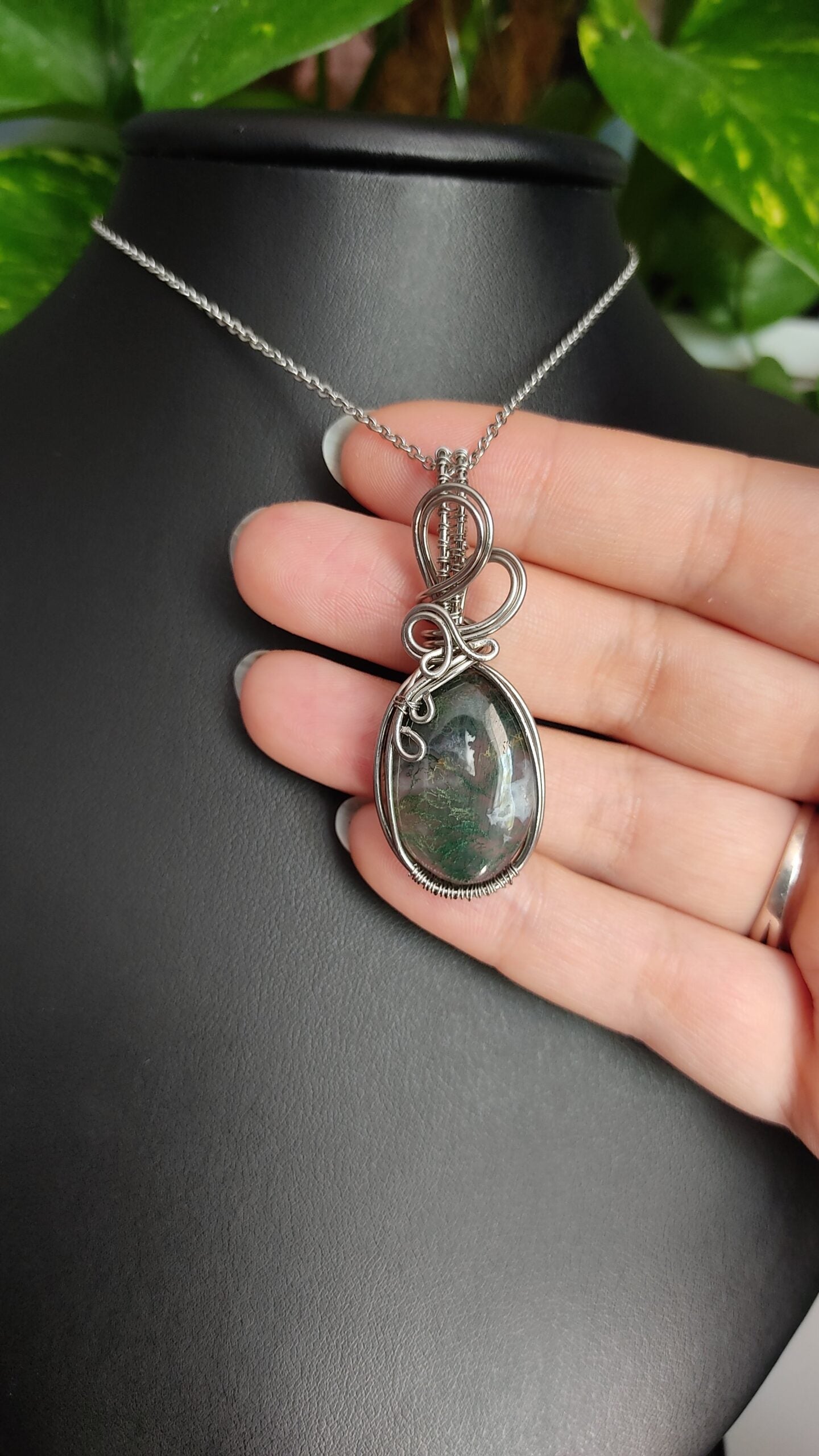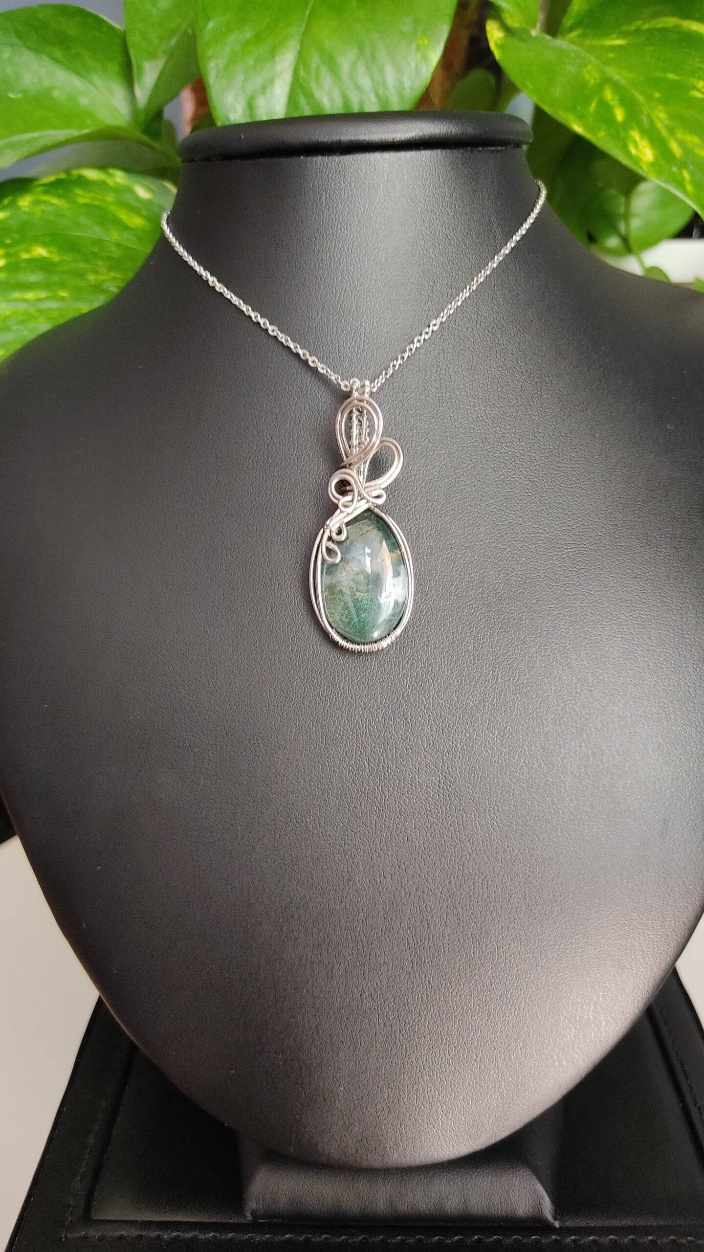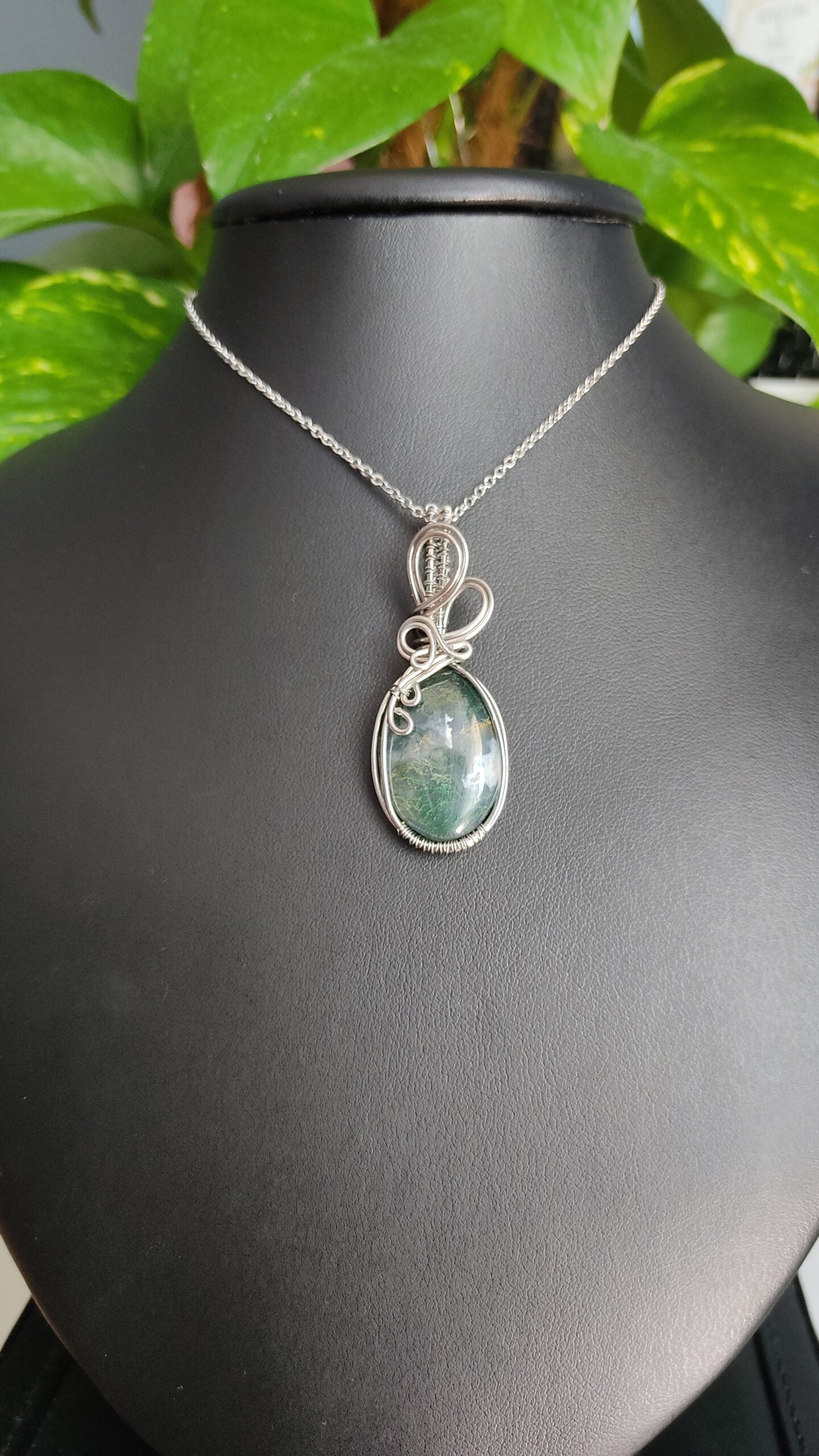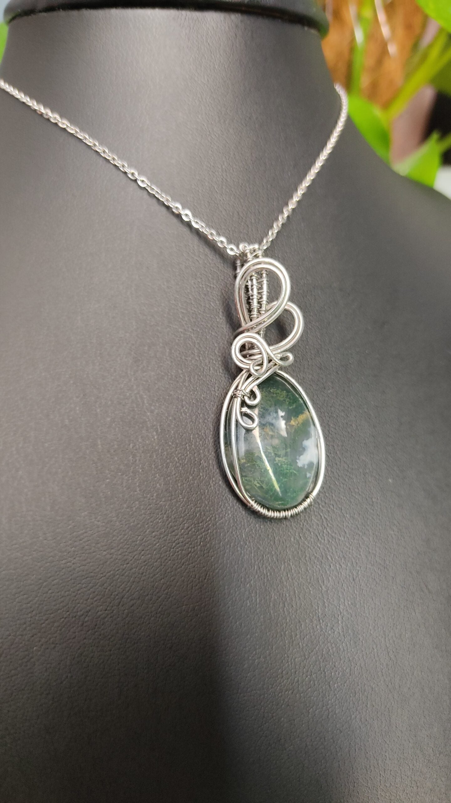 Ręcznie robiony wisiorek z agatem mszystym. Wykonany techniką wire wrapping z drutów ze stali chirurgicznej.