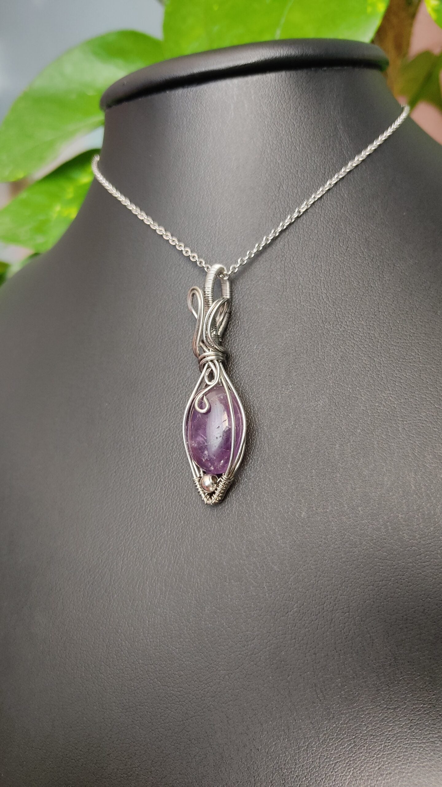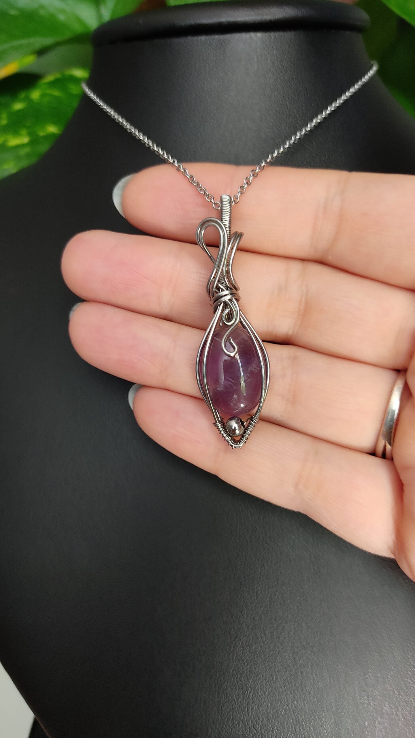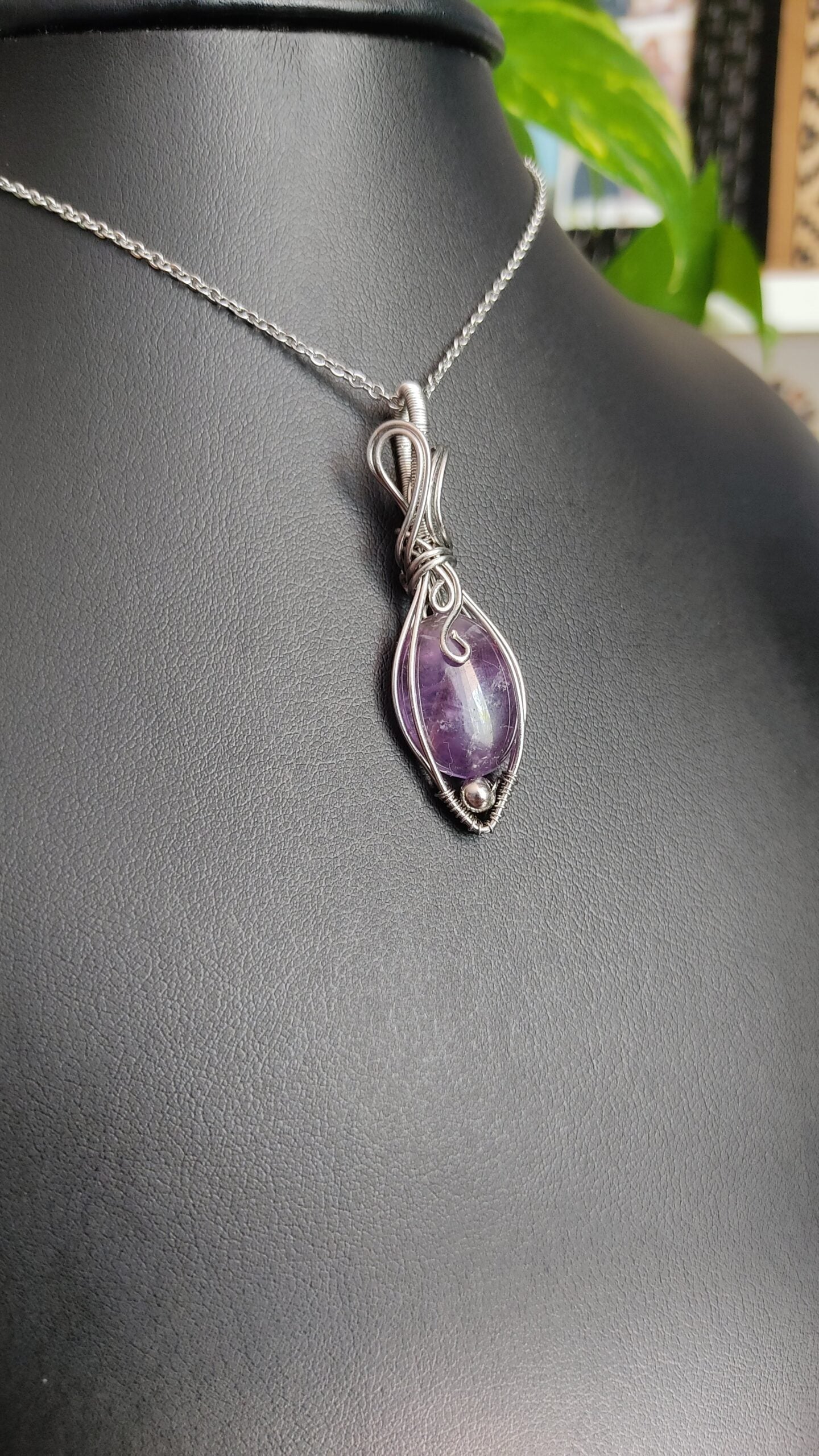 Ręcznie robiony wisiorek z ametystem. Wykonany techniką wire wrapping z drutów ze stali chirurgicznej.
