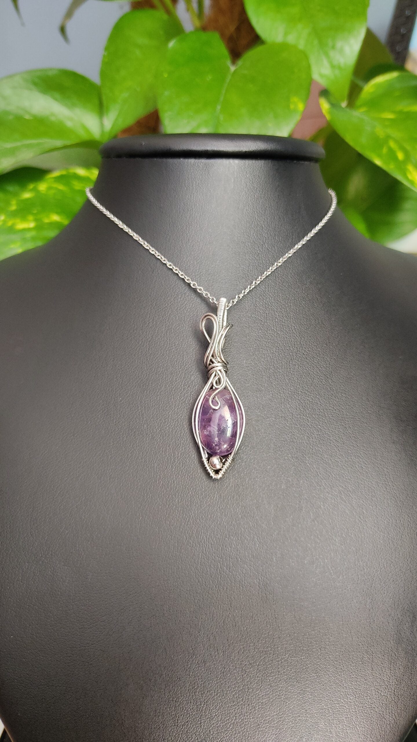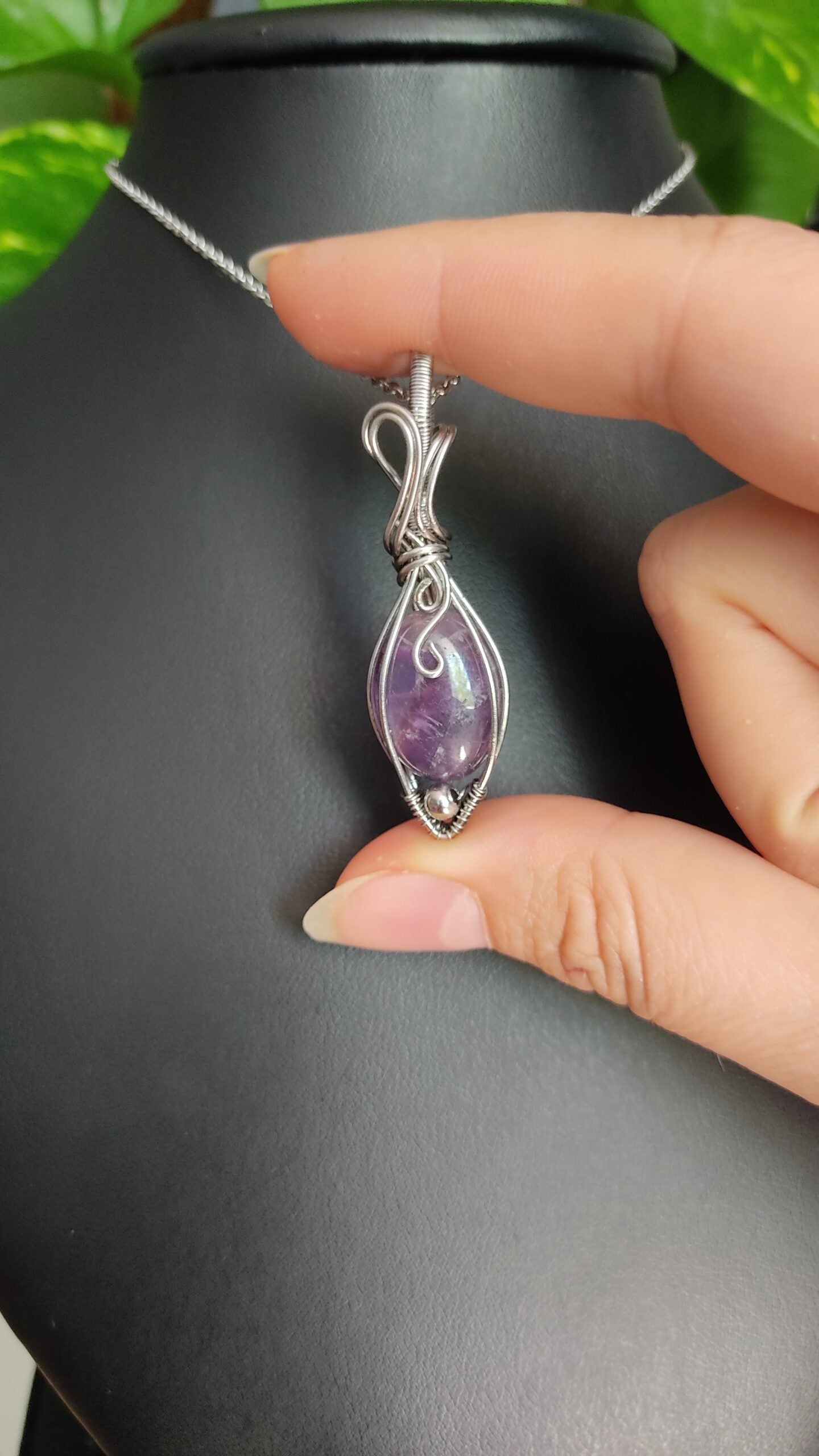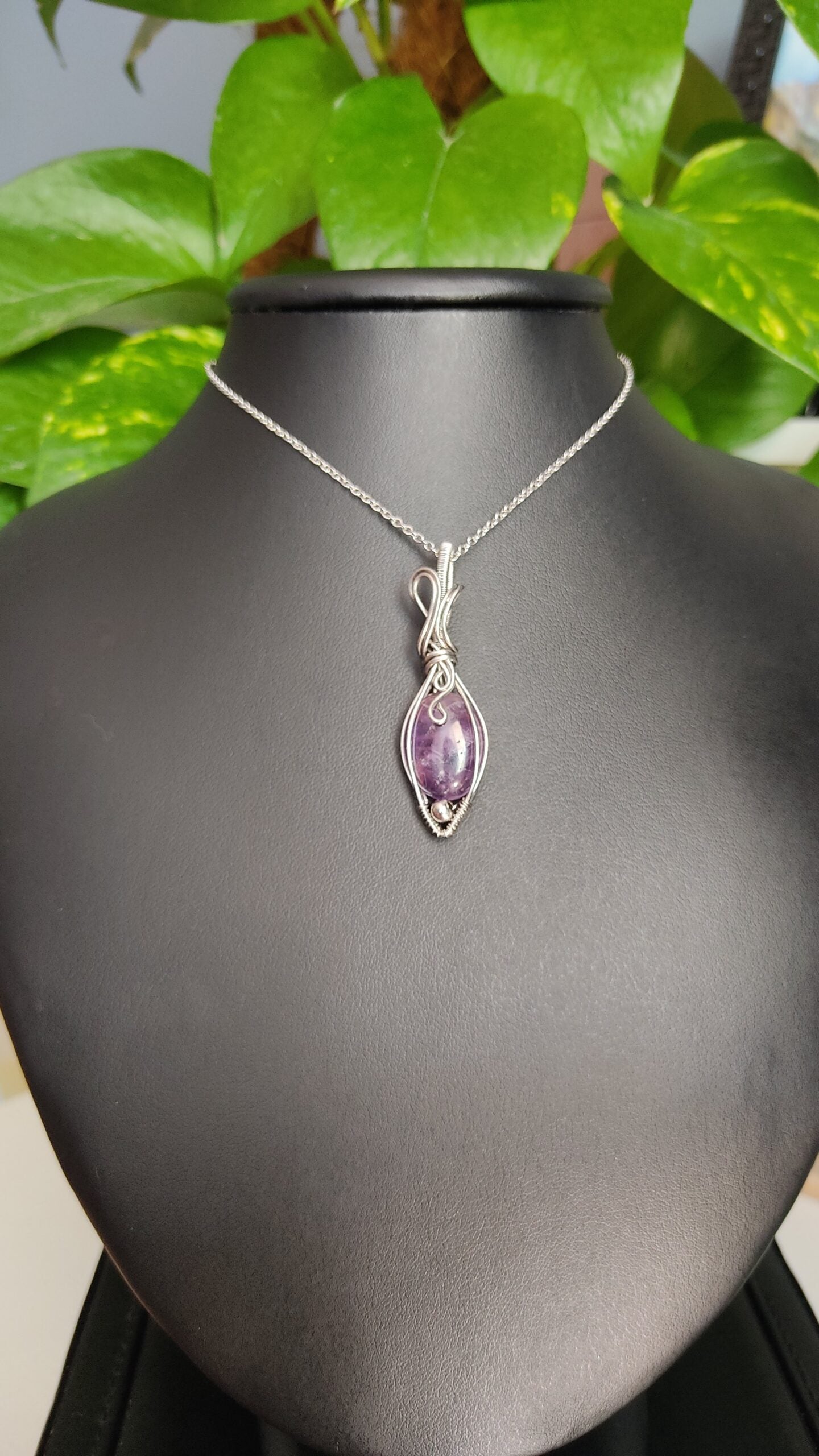 Ręcznie robiony wisiorek z ametystem. Wykonany techniką wire wrapping z drutów ze stali chirurgicznej.