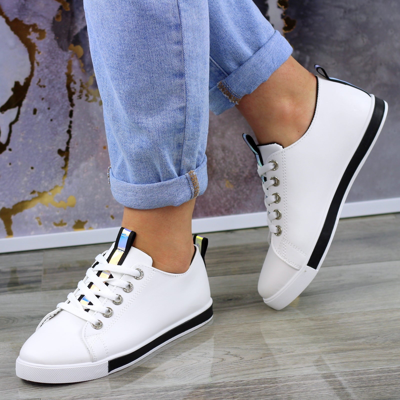 MODNE BIAŁO CZARNE SKÓRZANE TRAMPKI DAMSKIE SZNUROWANE