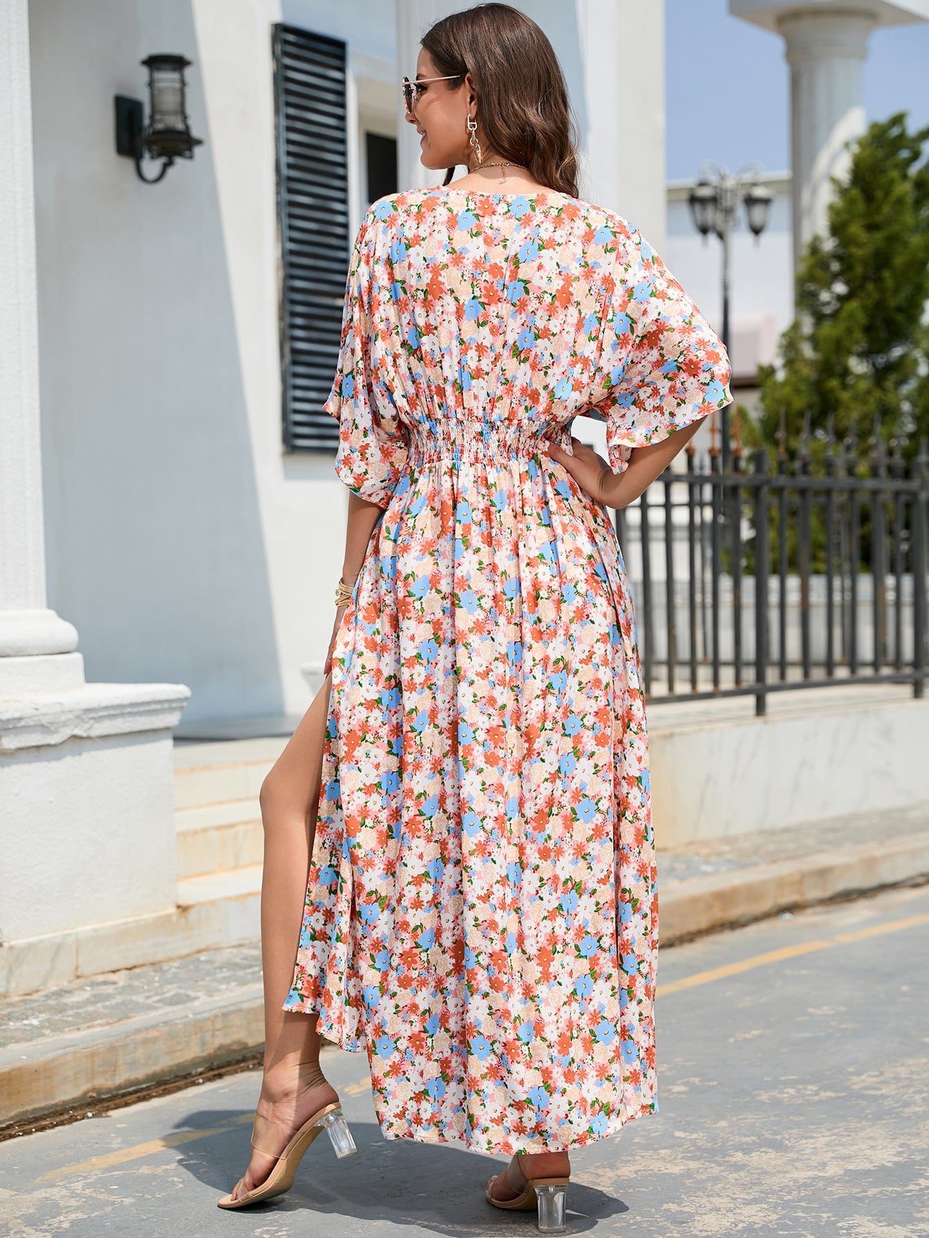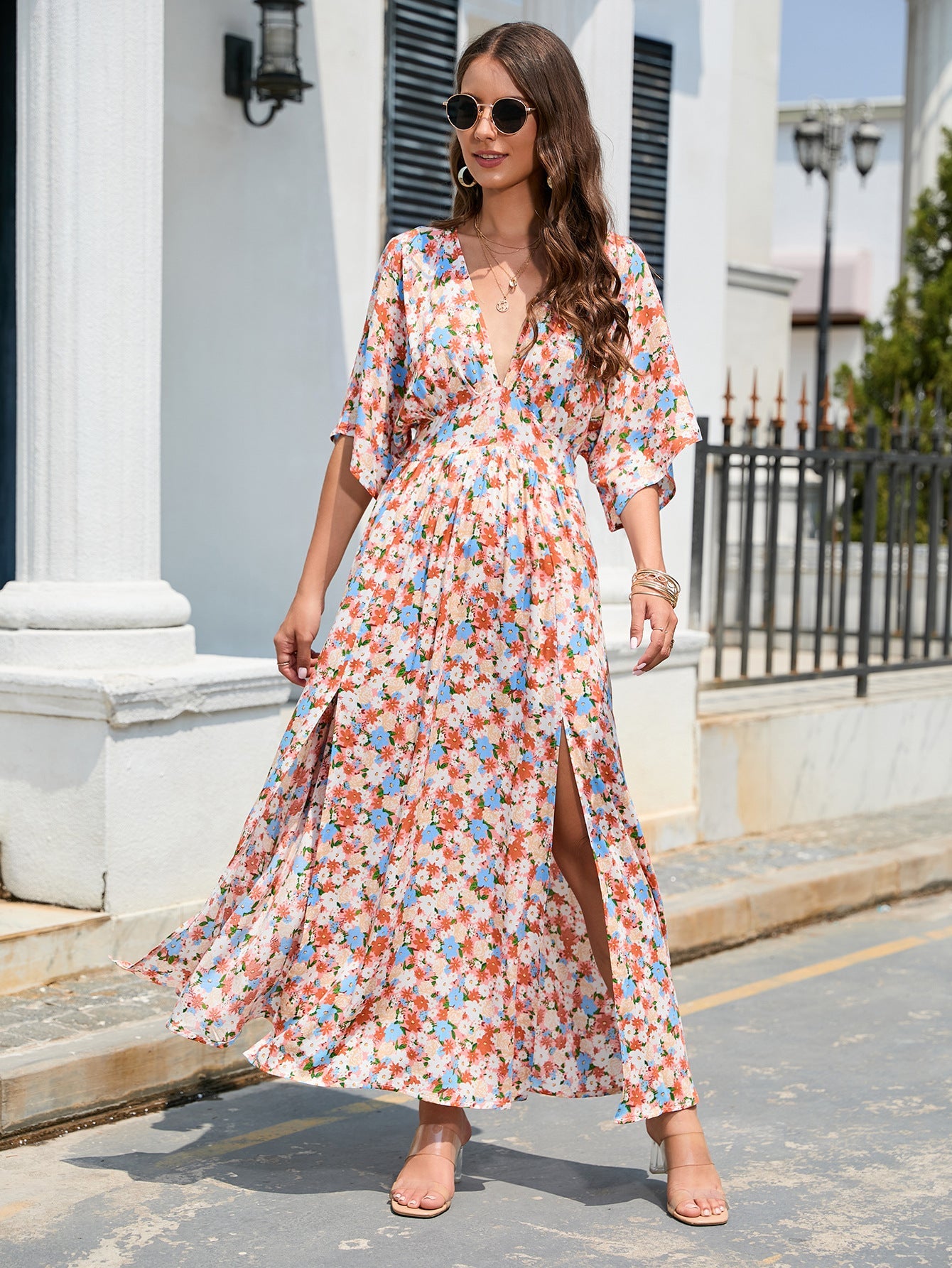 Damska letnia sukienka z nadrukiem 2023, dekolt w serek, z krótkim rękawem, sznurkiem, wzburzona sukienka Boho Floor Maxi