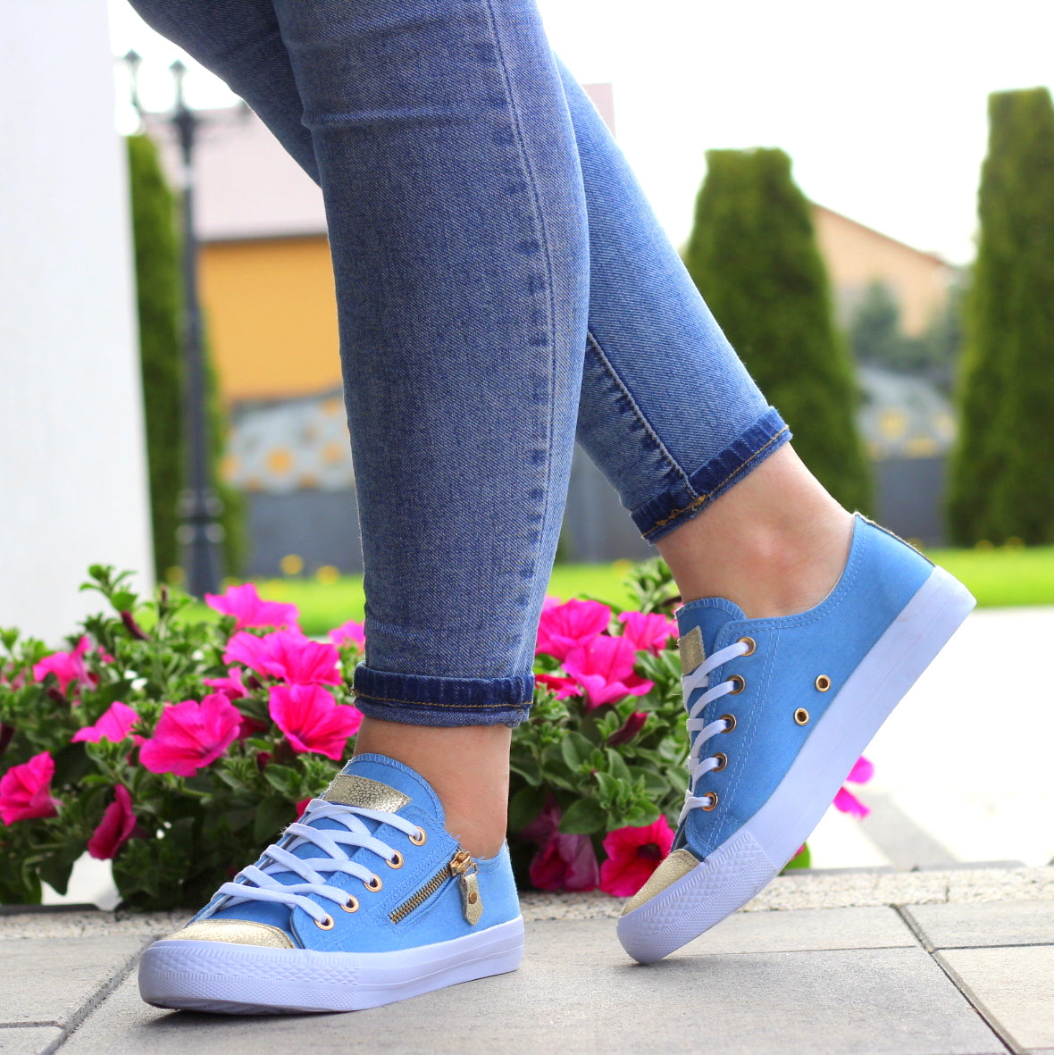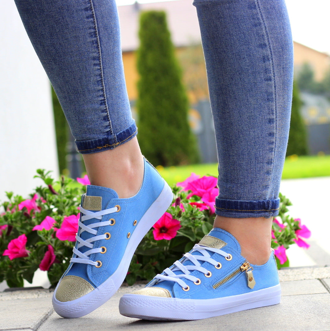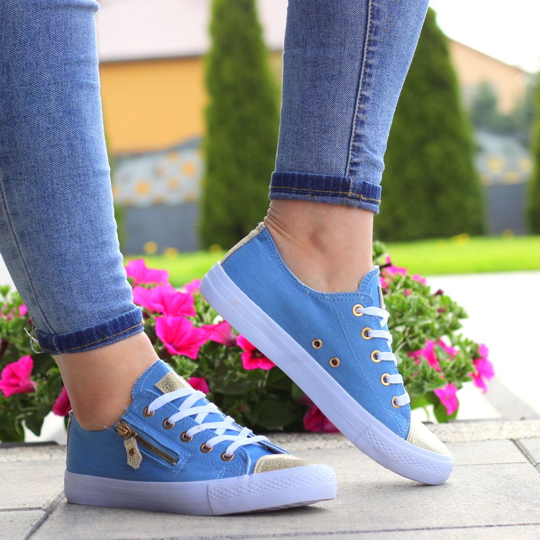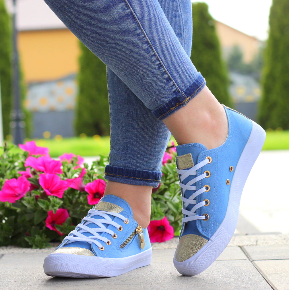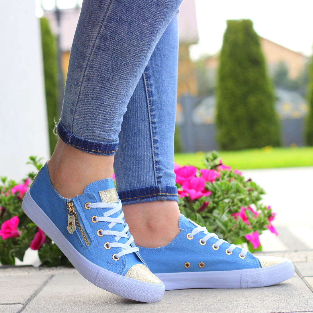 NIEBIESKIE sznurowane gładkie trampki damskie złoty nosek suwak