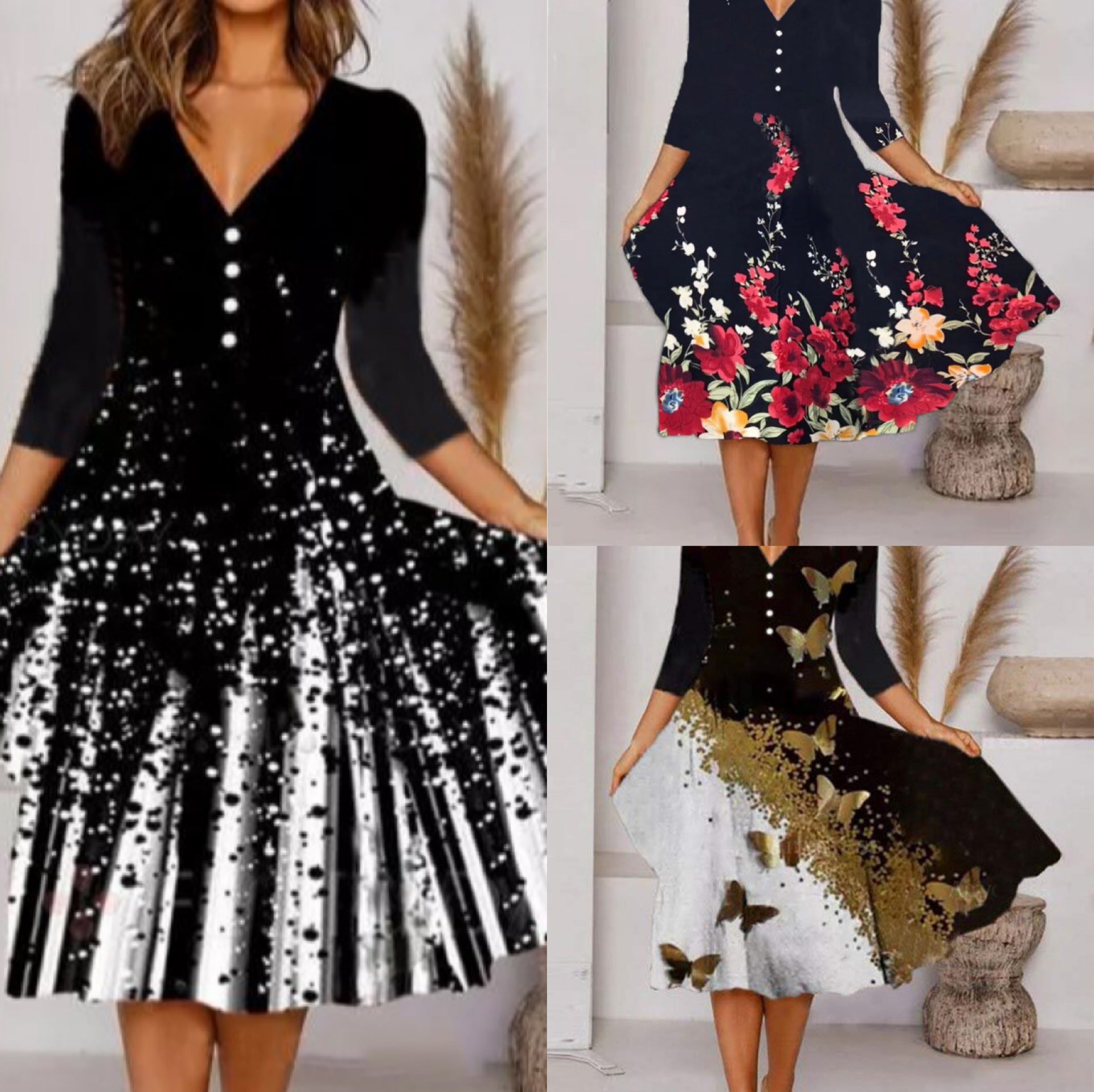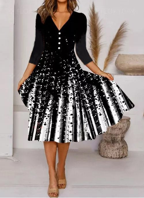 Drukowana sukienka V-neck z siedmioczęściowym rękawem